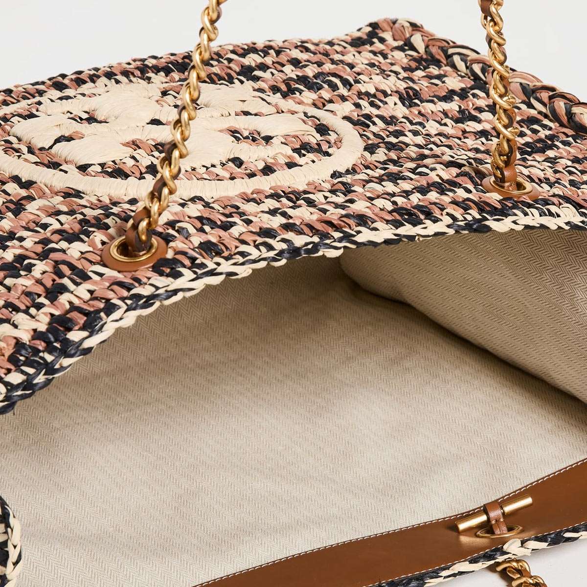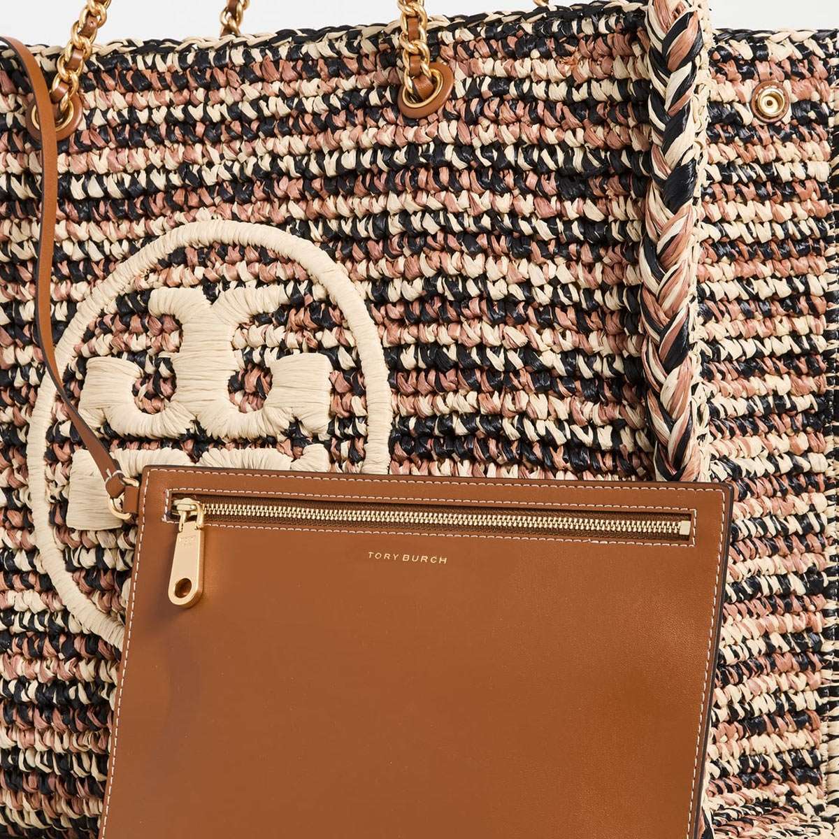 ■商品名 トリーバーチ エラ ラフィア チェーン トートTory Burch ELLA RAFFIA CHAIN TOTE ■カラー Classic Cuoio/Natural ■素材 Raffia, leather ■商品詳細 ・高さ(約)33cm x 横(約)43.5cm x 幅(約)18cm・マチ付きスナップ開閉式・レザーとチェーンのトップハンドル、高さ(約)23cm・取り外し可能なファスナーポーチ ■ 商品説明 ナチュラルな美しさ。