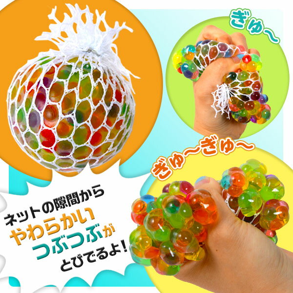 ボールをぎゅっと握りつぶすと、ネットの隙間からカラフルなつぶつぶが飛び出るよ!※色柄はアソート(混合)になります。