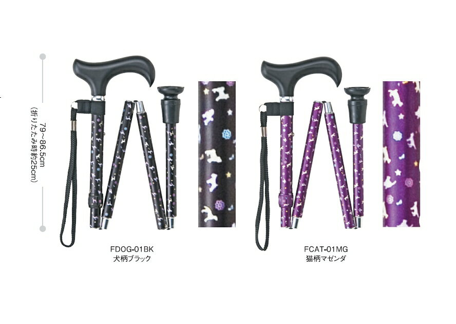 ●カラー/犬柄ブラック、猫柄マゼンタ ●長さ/79〜86.5cm(伸縮4段階調節2.5cm間隔) ●杖先ゴム/16Φ(DDP-16BK) ●重量/約295g ●材質/支柱(アルミ)、握り部(木製)、ストラップ(ナイロン)、収納袋