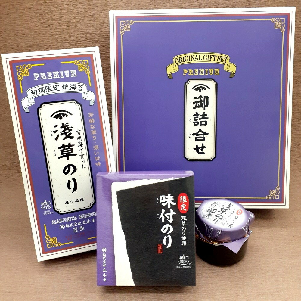 浅草焼海苔・味付海苔セット 浅草焼海苔半切12枚(全型6枚分)×1 浅草味付海苔8切40枚(全型5枚分)×1 浅草海苔佃煮 80g×1希少品種「アサクサノリ」の焼海苔 味付海苔、佃煮のギフトセット 御中元 お中元 御歳暮 お歳暮 内祝い