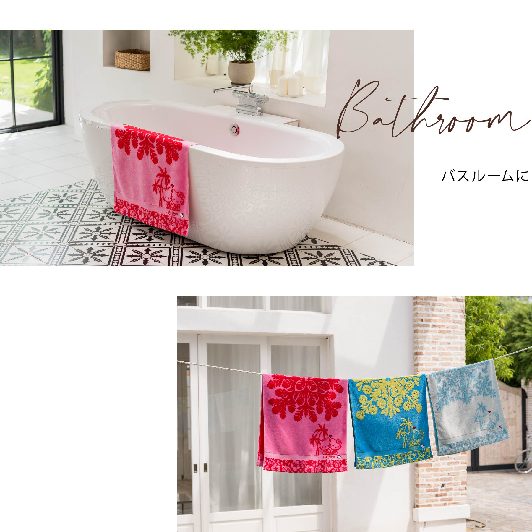 キャシー中島さんがプロデュースするライフスタイルブランド「キャシーマム」と、永遠に愛されるキャラクター「ハローキティ」と、ハローキティのボーイフレンド「ディアダニエル」とのコラボレーションによる、リゾート感あふれるバスタオルです。