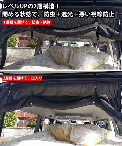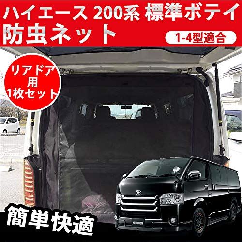 ・【適合車種】ハイエース 200系 標準ボディー 1-4型適合・"【セット内容】 リアラゲート 1面"・"【材質】 内側生地 : 薄い半透明蚊帳生地 外側生地 : 内側より厚い半透明紋帳生地"・【色】ブラック・使用しないときは、ファスナー・マジックテープで簡単に上部に収納して固定できます。
