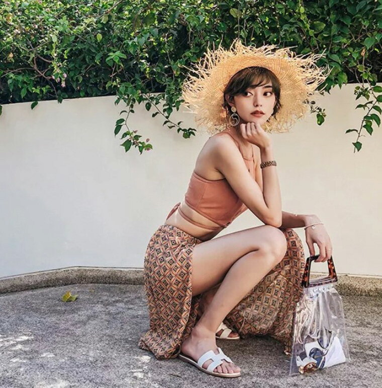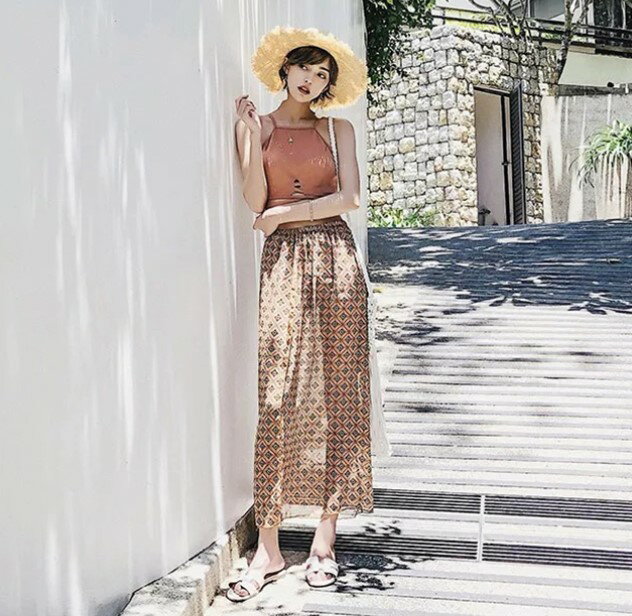 バッククロスデザインが女子力をUP リゾート感を増してくれる柄スカートはさり気なく体型カバーも◎ シンプルながらもキュートさを忘れずに、とことん女子度をアップできます。