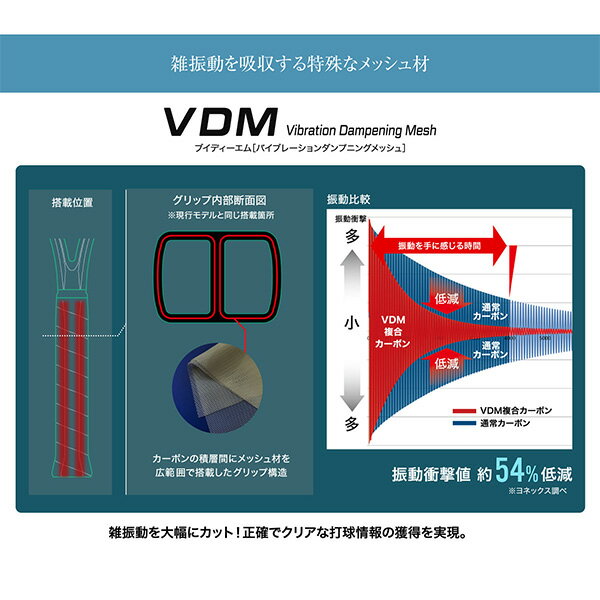 こちらに従来のアイソメトリック形状によるスウィートスポットの広さ、振動吸収素材「VDM」による振動吸収性も合わさることで、初心者から上級者まで幅広い層の方々に快適にプレーいただけるラケットに仕上がっております。