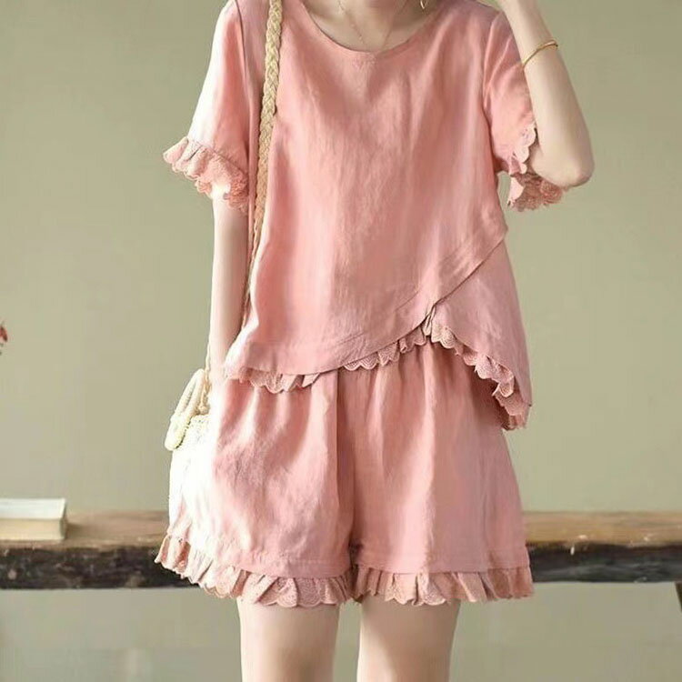 素材・セット内容 ◆素材構成: 100%分類外繊維(綿混紡織物) ◆半袖不規則プルオーバーとワイド短パンがセットになったレディースリラックススウェットセットです。