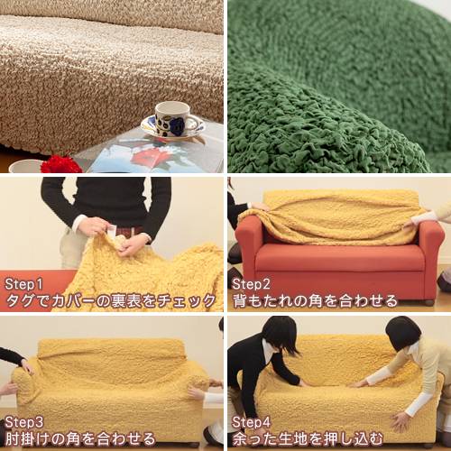 ソファカバー 2人掛け 肘あり イタリア製 ストレッチフィットの解説 どんな形にも合わせやすい!かぶせたら余った部分をソファのすき間に 押し込むだけ♪