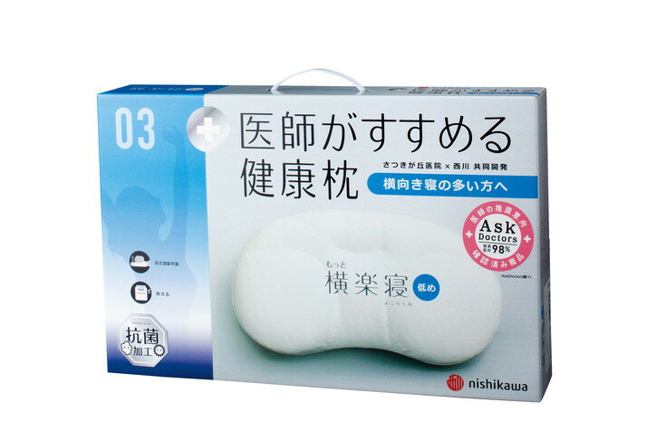 商品詳細 内容量 [医師がすすめる健康枕]もっと横楽寝/低め サイズ;63×35cm 側 表地:綿90%ポリエステル10% 裏地:綿100% 詰め物 ポリエチレンパイプ高さ調節シート入り 側:抗菌加工シートによる高さ調節(両サイド) 〈側:中国製 製品仕上げ:日本製 高さ調節シート:中国製〉 詳細 【 ふとんの西川 】 発祥の地 近江八幡市内の工場で生産されたものをお届け! カラダのプロと眠りのプロがつくった快眠枕。