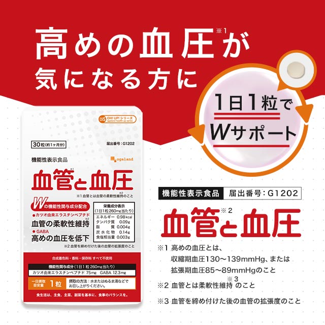【新発売】 血管と血圧(12個セット・約12ヶ月分)機能性表示食品 1日1錠 血圧 サプリ サプリメント 血管 柔軟性 高めの 血圧 低下 カツオ由来 エラスチン GABA ギャバ 健康 血圧 が高めの方に オーガランド