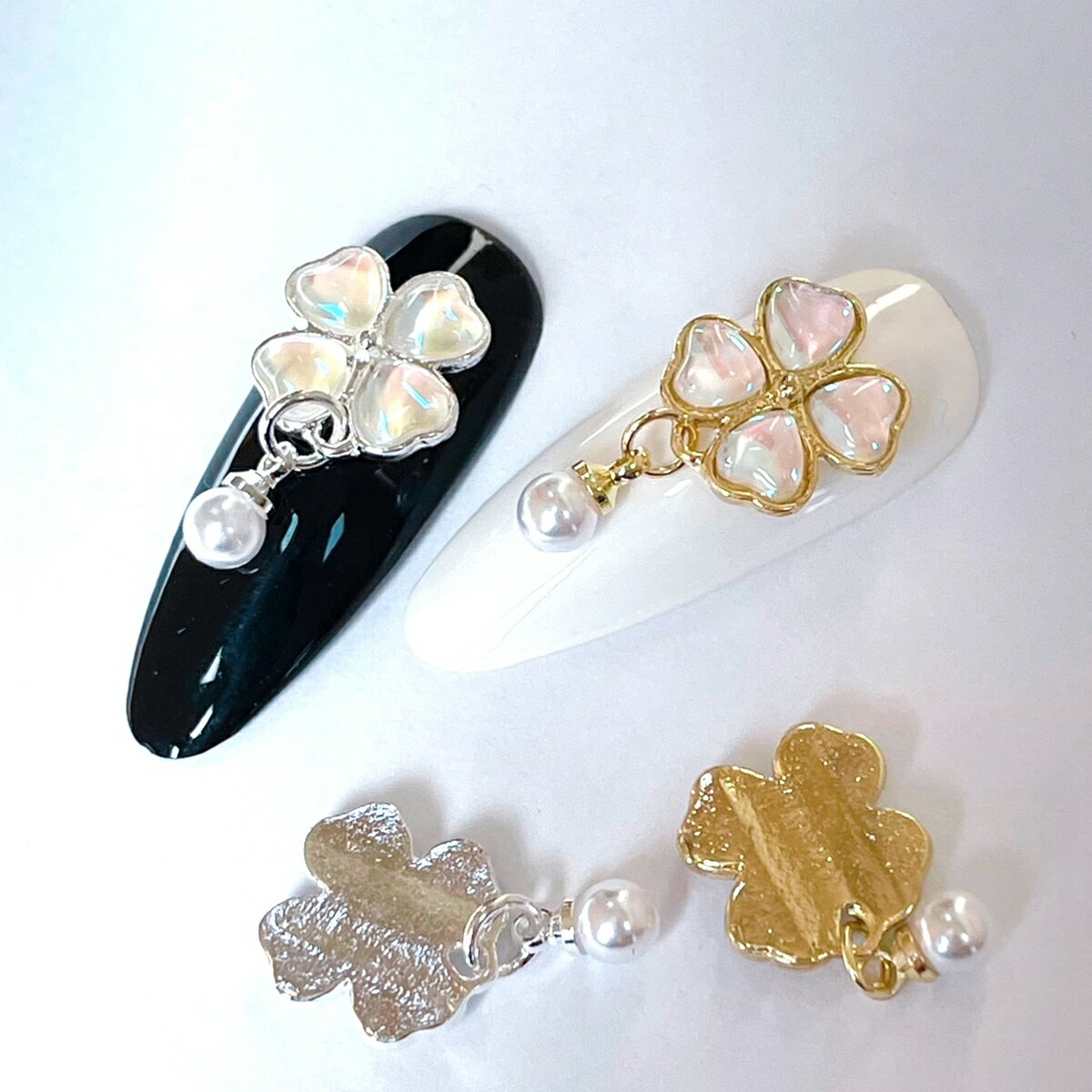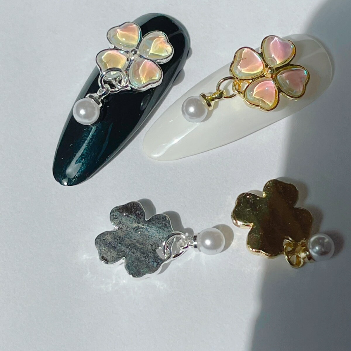 サイズサイズ 約11×20ミリ 素材:メタル パール ガラスストーン特徴うるうるハートが4つでできた、クローバーデザインネイルチャーム。