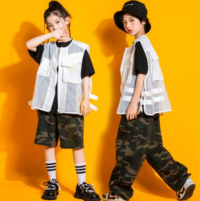 キッズダンス衣装 個性 jazz hiphop 迷彩柄 カーゴパンツ カモフラージュ メッシュ カーゴベスト かっこいい ジャズ ヒップホップ 演出服 男女お揃い 舞台演出服 ステージ衣装