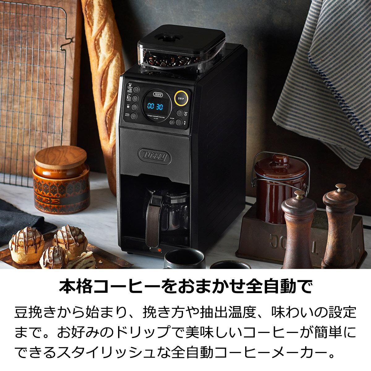 商品説明 豆の挽き具合や味わいが選べる全自動ミル付きコーヒーメーカー。