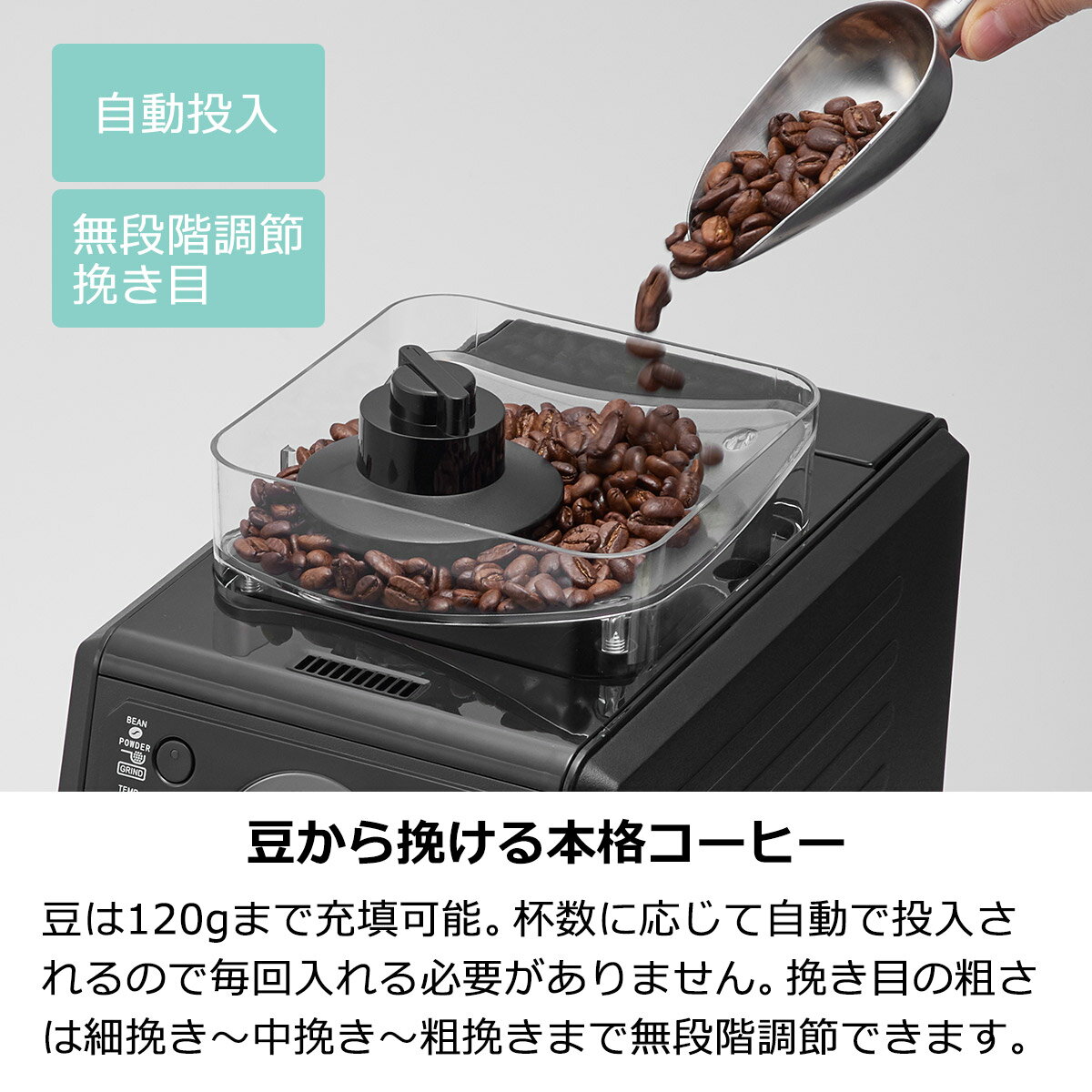 豆タンクは120gまで充填可能、豆を計量する必要がない自動投入構造となっています。
